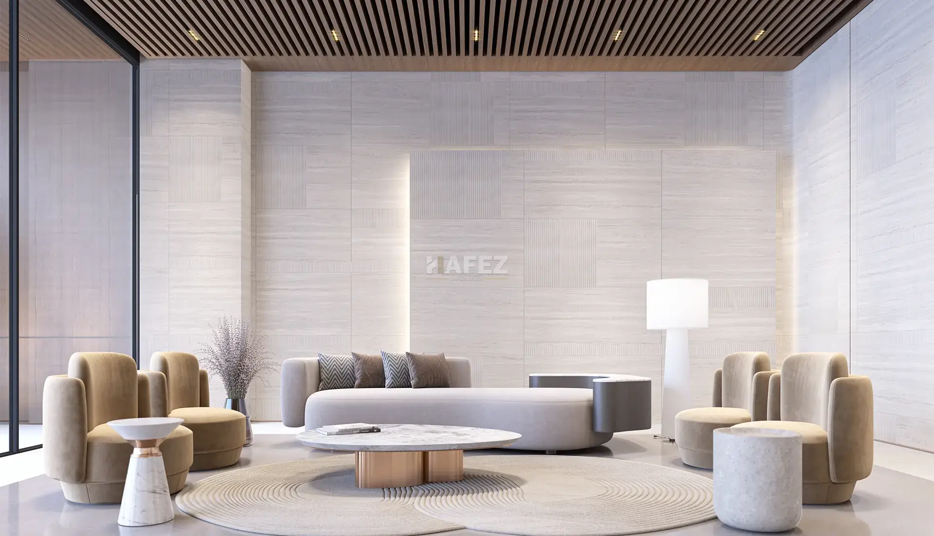 Traverten, mermer, ahşap kaplamalar ve renkli cam ile premium iç mekan finisajları